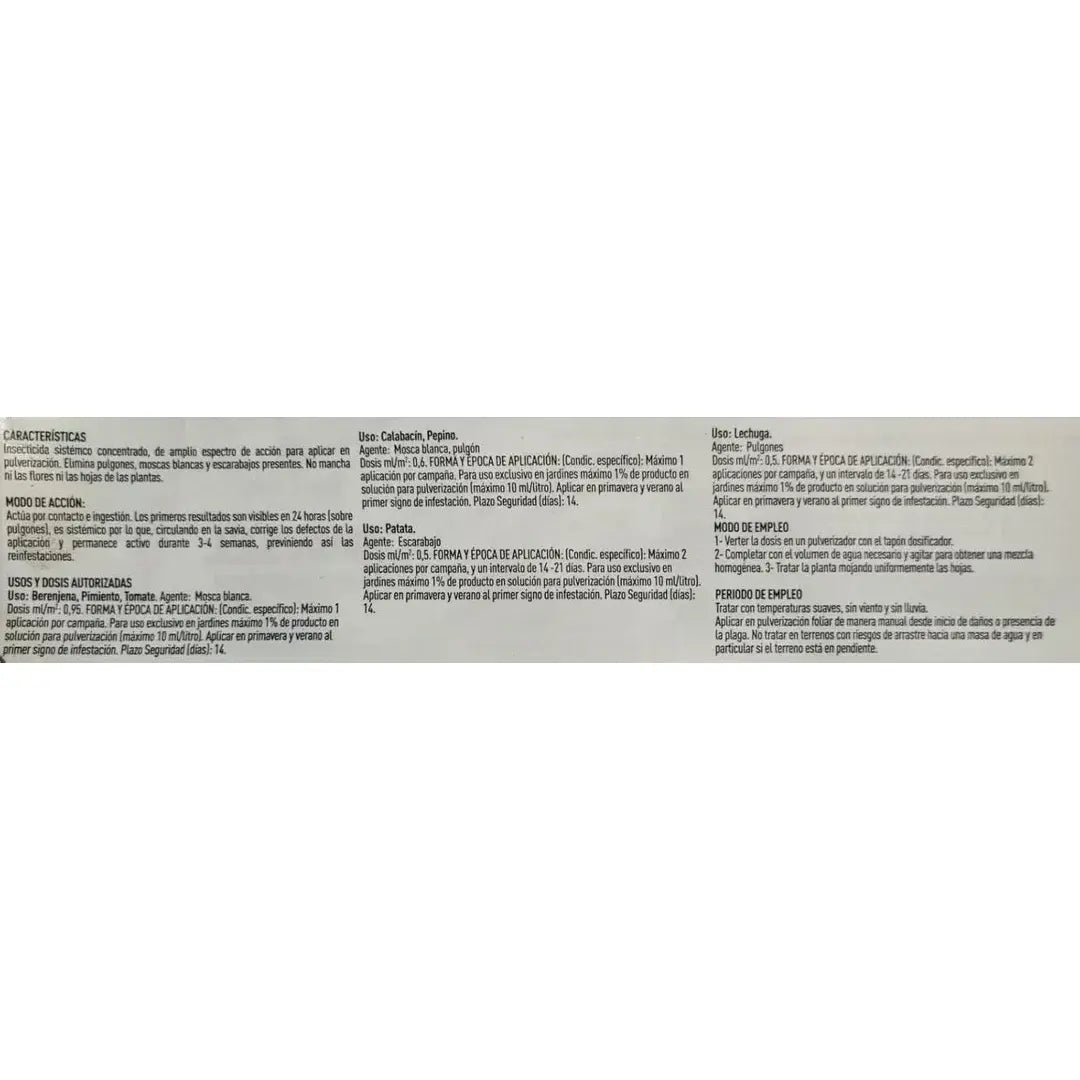 Insecticida sistémico de amplio espectro de acción para el control de cochinillas, pulgones, mosca blanca, escarabajo de la patata y minadores. Protege las plantas durante varias semanas actuando por contacto e ingestión y previniendo las reinfestaciones.